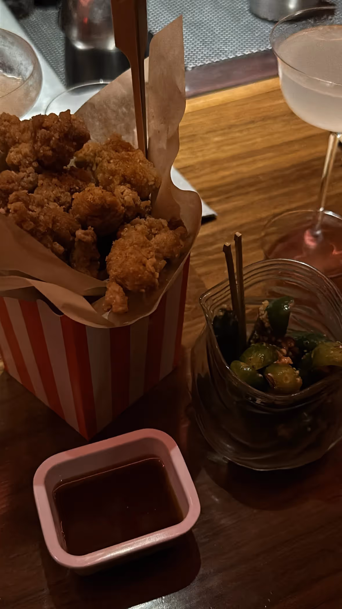 - popcorn chicken + hot honey sauce