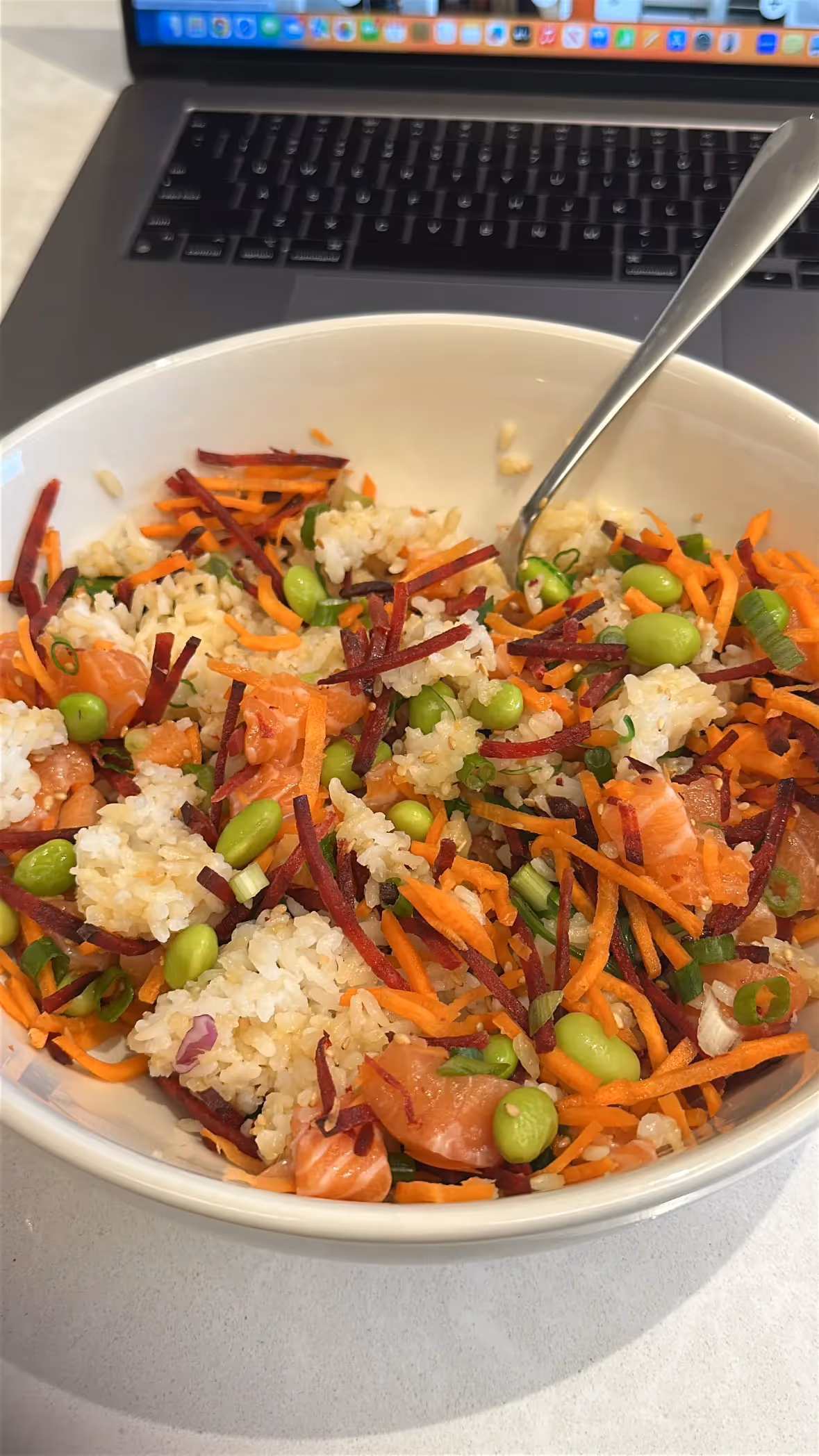 - ⭐️ build your own - sushi rice, carrot, beets, scallions, double edamame, no dressing, double salmon sashimi, no crunch, seaweed salad